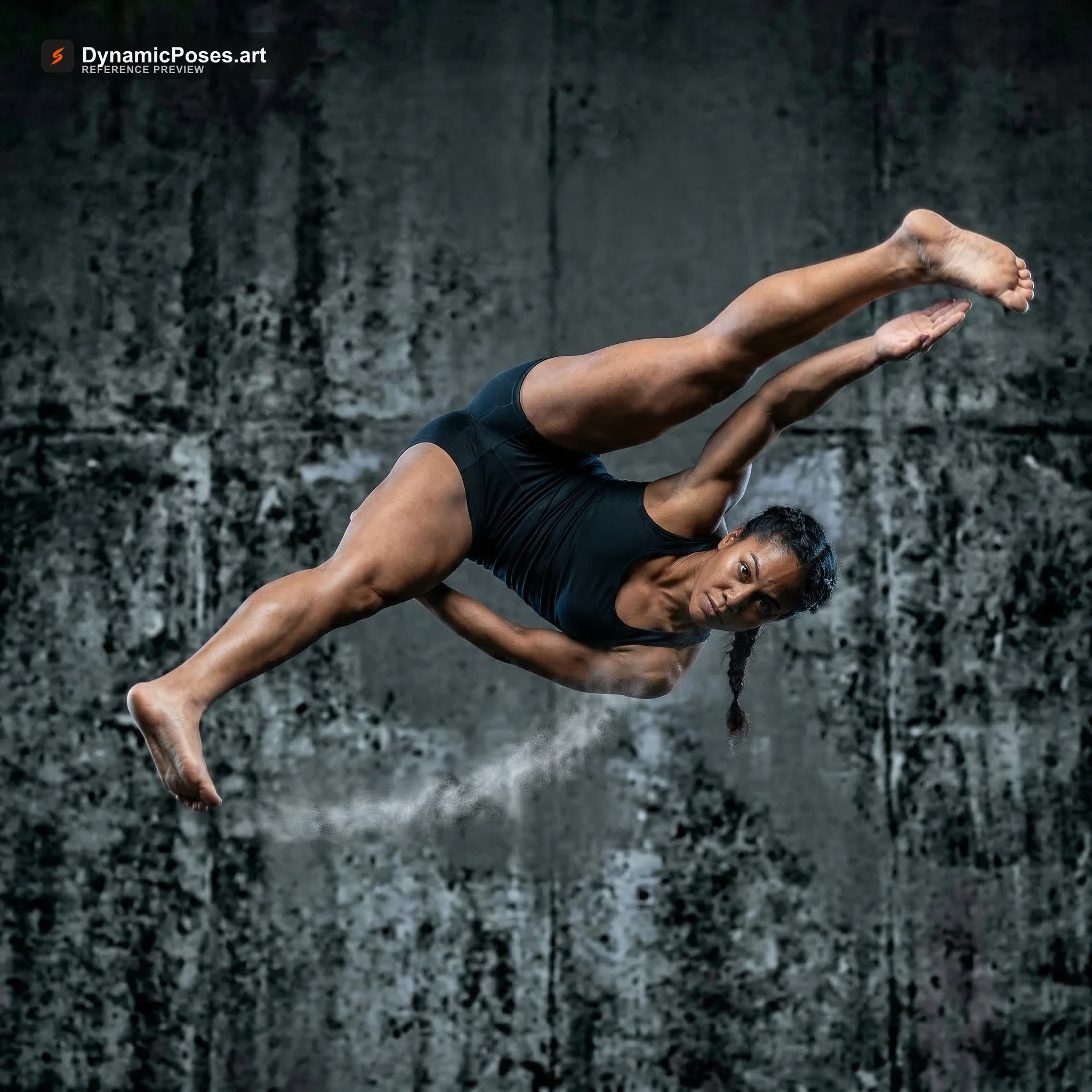 Butterfly Twist Mid Air is a female foreshortening study with a anatomy-focused setup. Use it as a royalty-free pose reference on DynamicPoses.art.